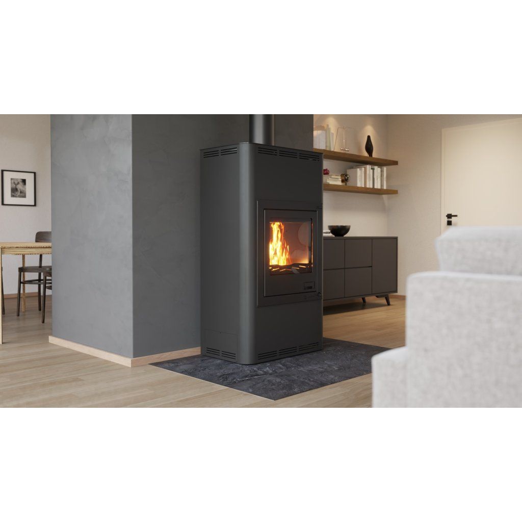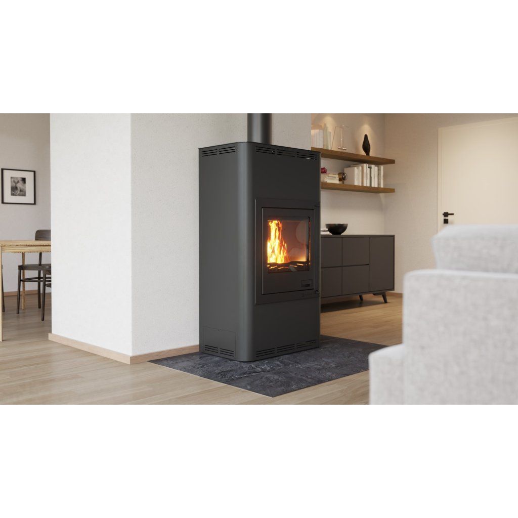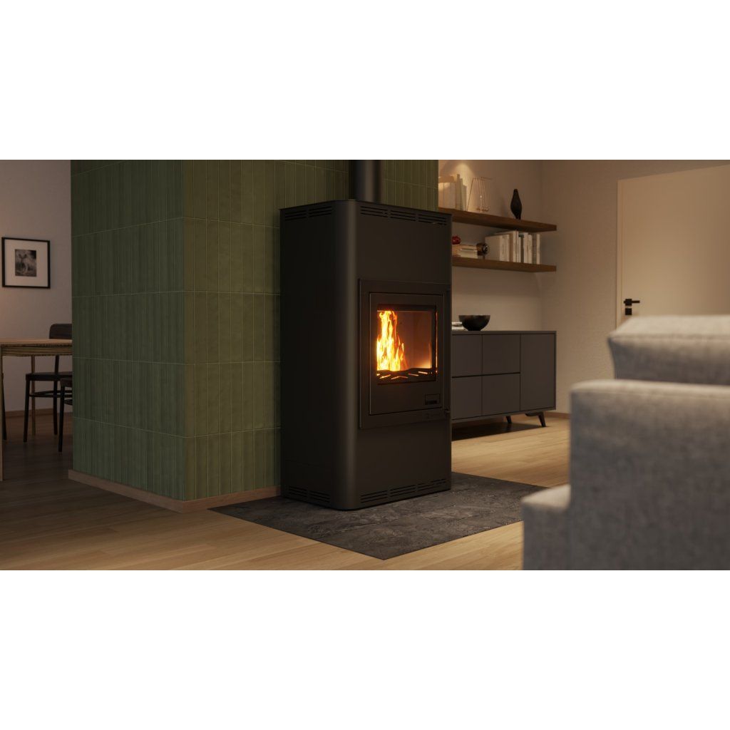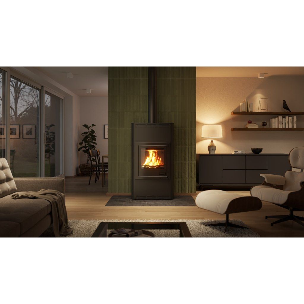Součástí kamen je moderní automatická regulace, která řídí spalovací proces pomocí vzduchové klapky a řídicí jednotky. Tepelná energie je efektivně odváděna do: