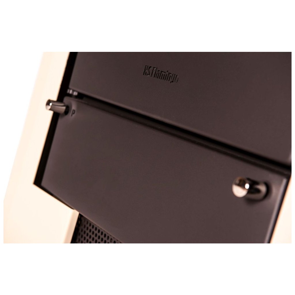 Komora je konstruovaná tak, aby byla dosažena vysoká účinnost a malá spotřeba paliva, která činí průměrně 2,5 kg na hodinu. Spalovací komora je vyrobená ze silného ocelového plechu a pro dokonalejší spalování je vysázena pravým šamotem. Sekundární spalování, krásně čisté sklo a externí přívod vzduchu je u kamen Flamingo samozřejmostí. Kamna jsou vyrobená z kvalitních materiálů a díky tomu Vám můžeme poskytnout záruku 5 let.