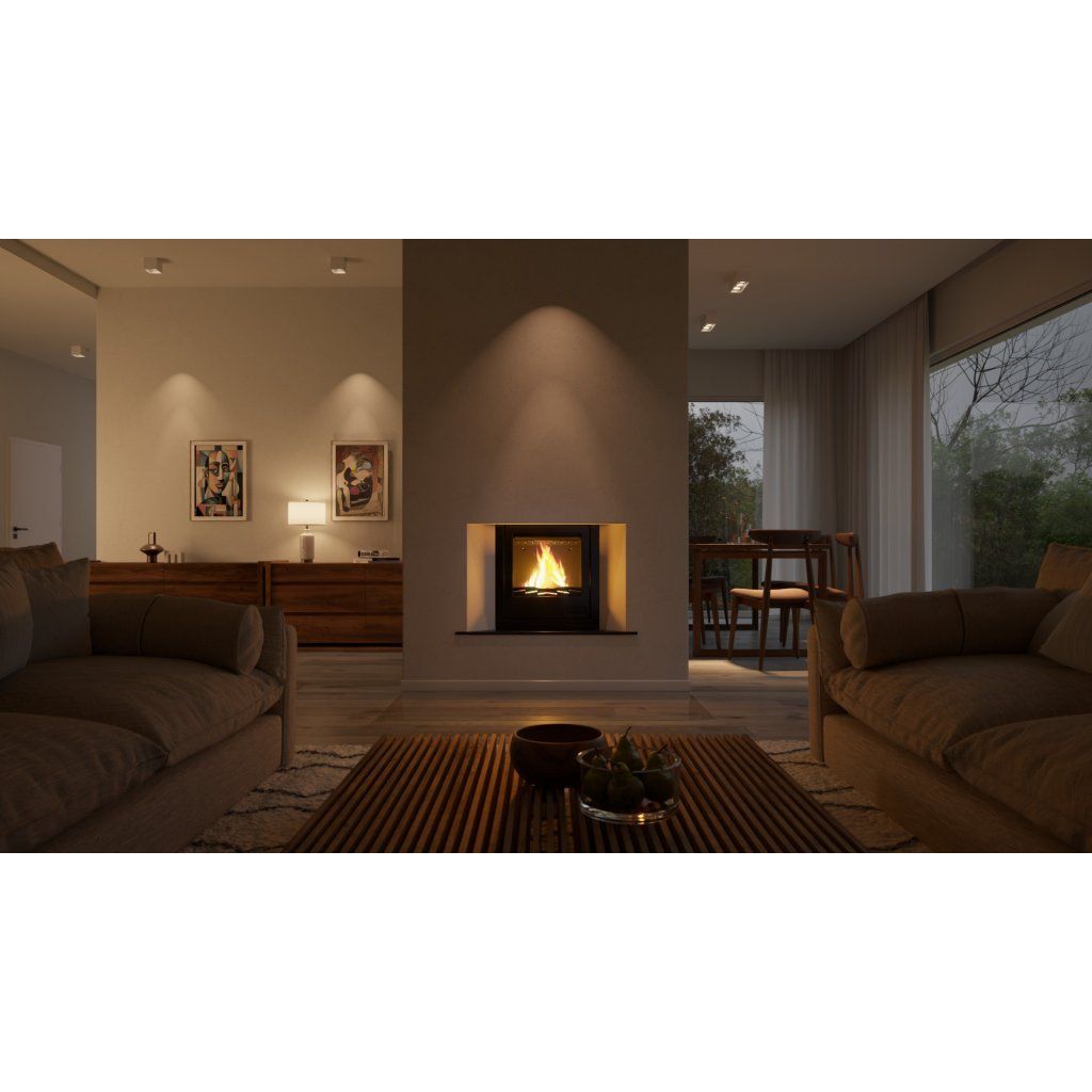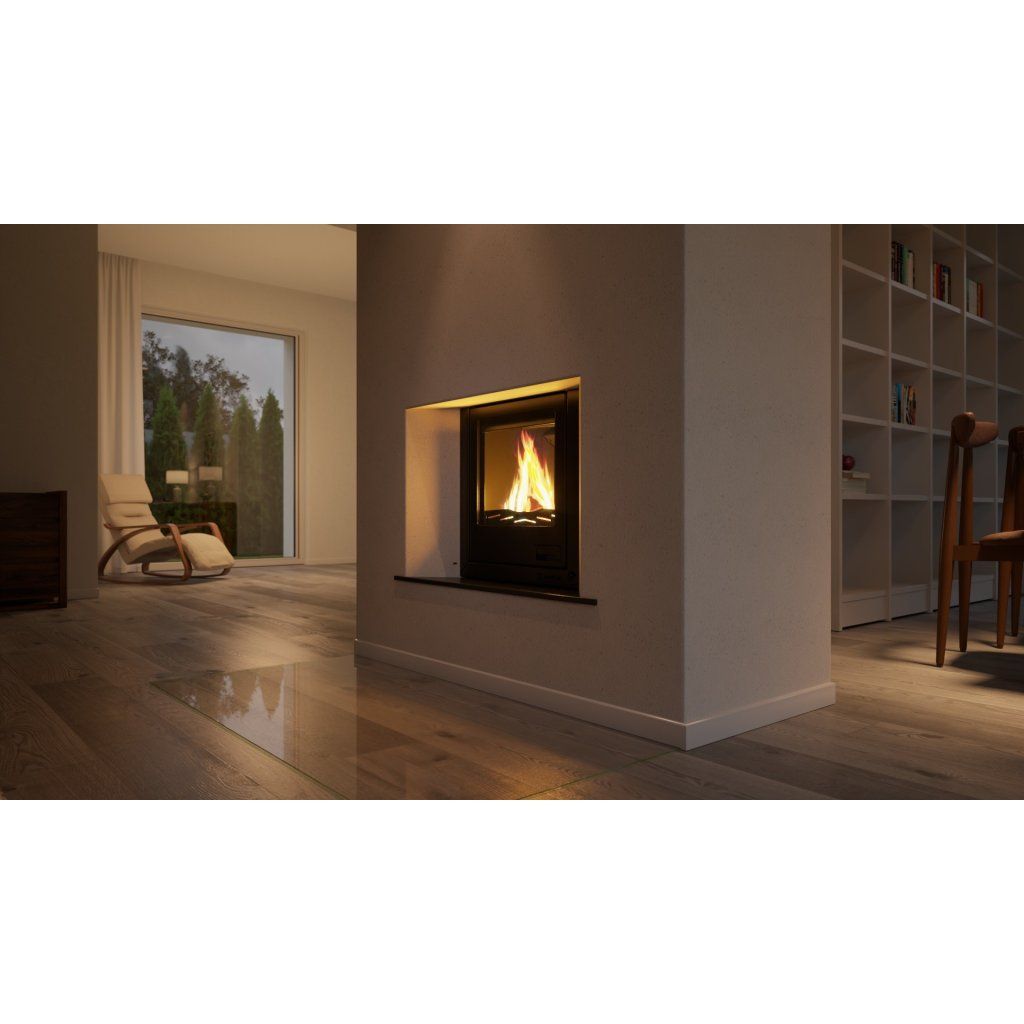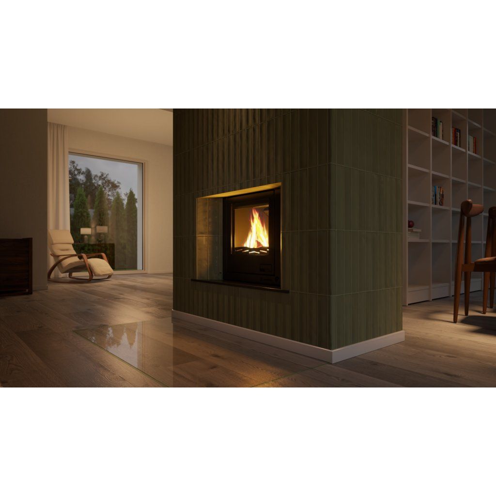 Vlastnosti: Dvojitý oplach skla, 3 bezpečnostní prvky, základní regulace hoření, demontovatelný rám, přípojky vody na obou stranách, klapka komínového tahu, zvukový hlásič přetopení.