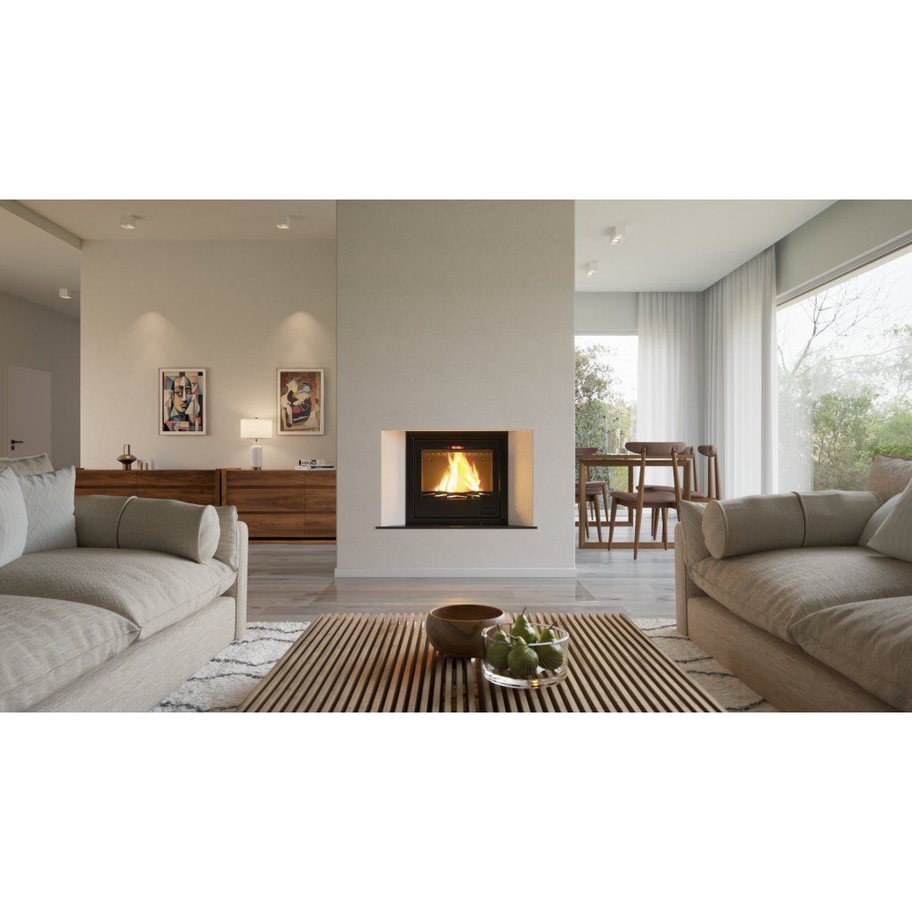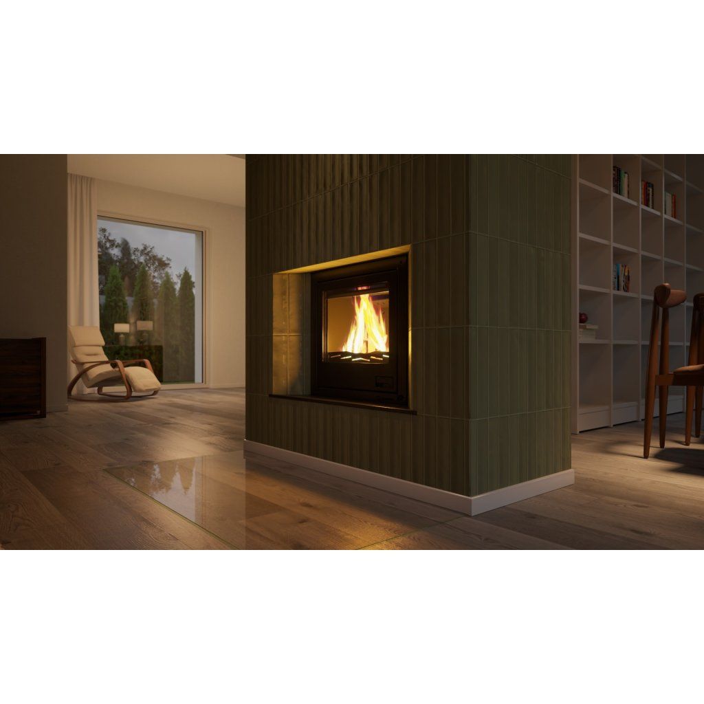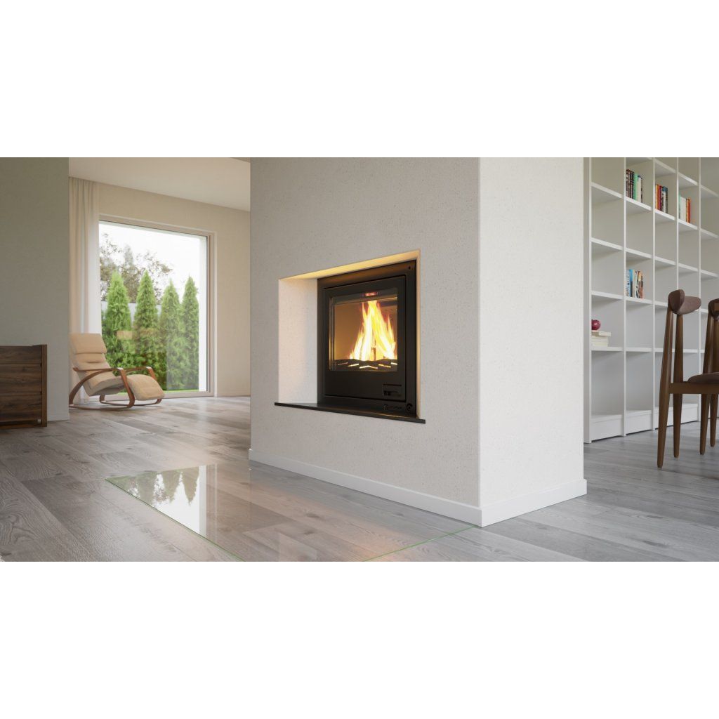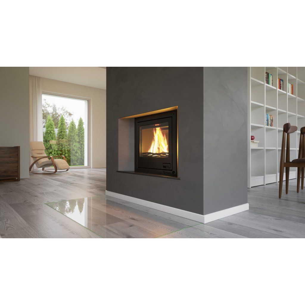 Vlastnosti: Dvojitý oplach skla, 3 bezpečnostní prvky, základní regulace hoření, demontovatelný rám, přípojky vody na obou stranách, klapka komínového tahu, zvukový hlásič přetopení.