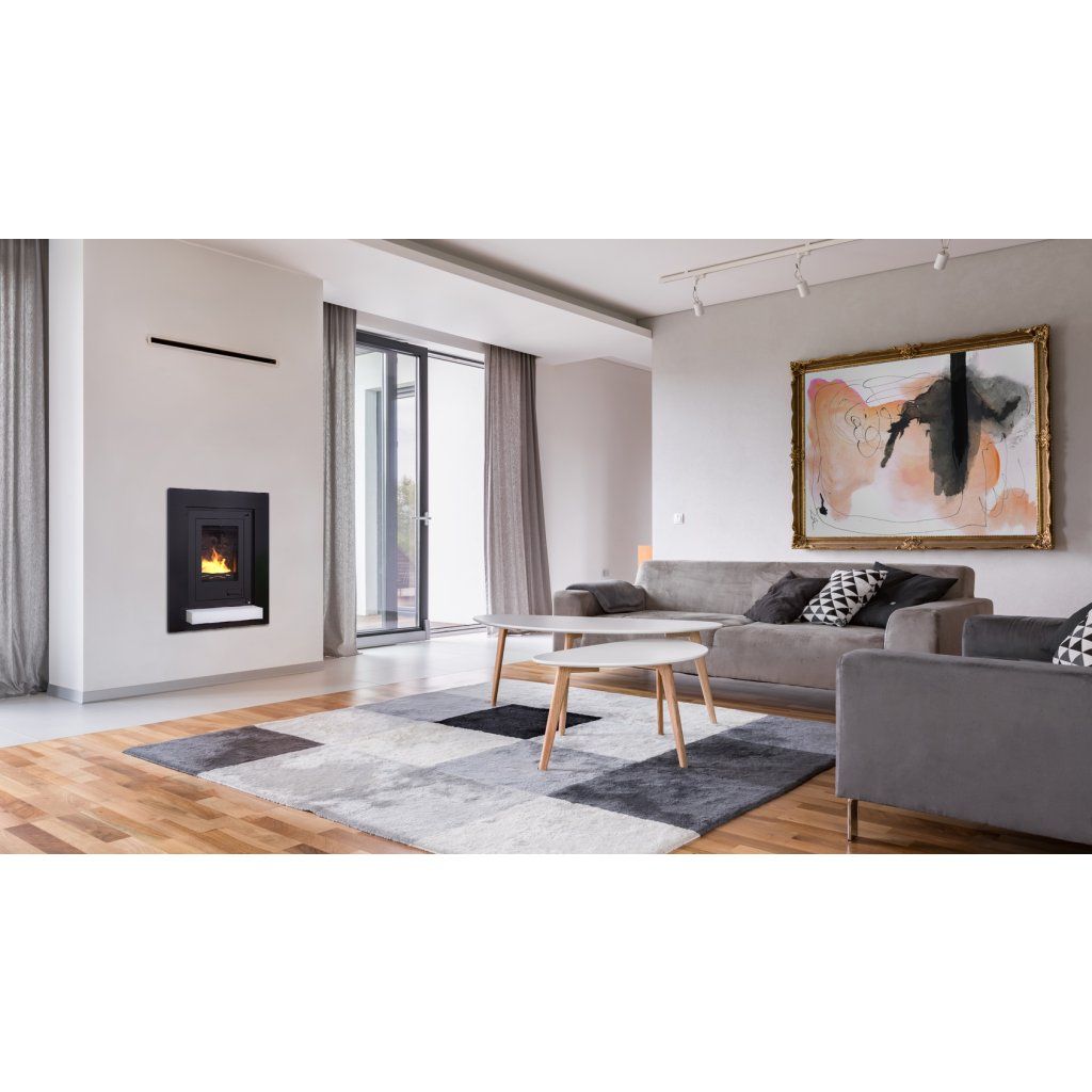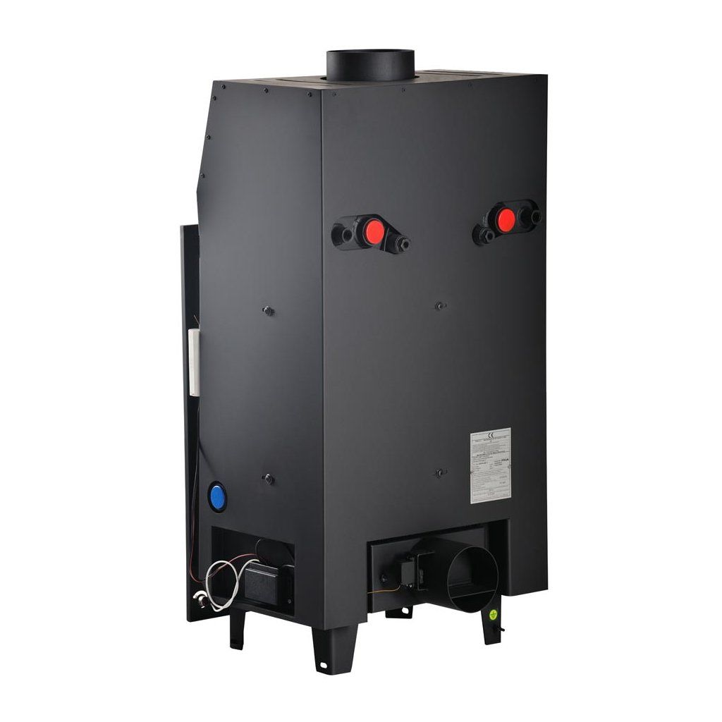 Vlastnosti: Dvojitý oplach skla, 3 bezpečnostní prvky, základní regulace hoření, demontovatelný rám, přípojky vody na obou stranách, klapka komínového tahu, zvukový hlásič přetopení.
