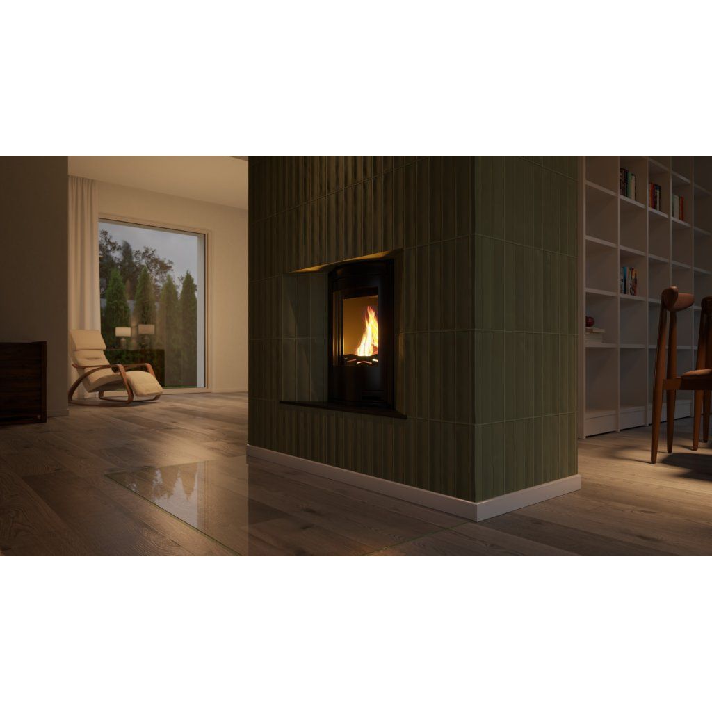 Vlastnosti: Dvojitý oplach skla, 3 bezpečnostní prvky, základní regulace hoření, demontovatelný rám, přípojky vody na obou stranách, klapka komínového tahu, zvukový hlásič přetopení.