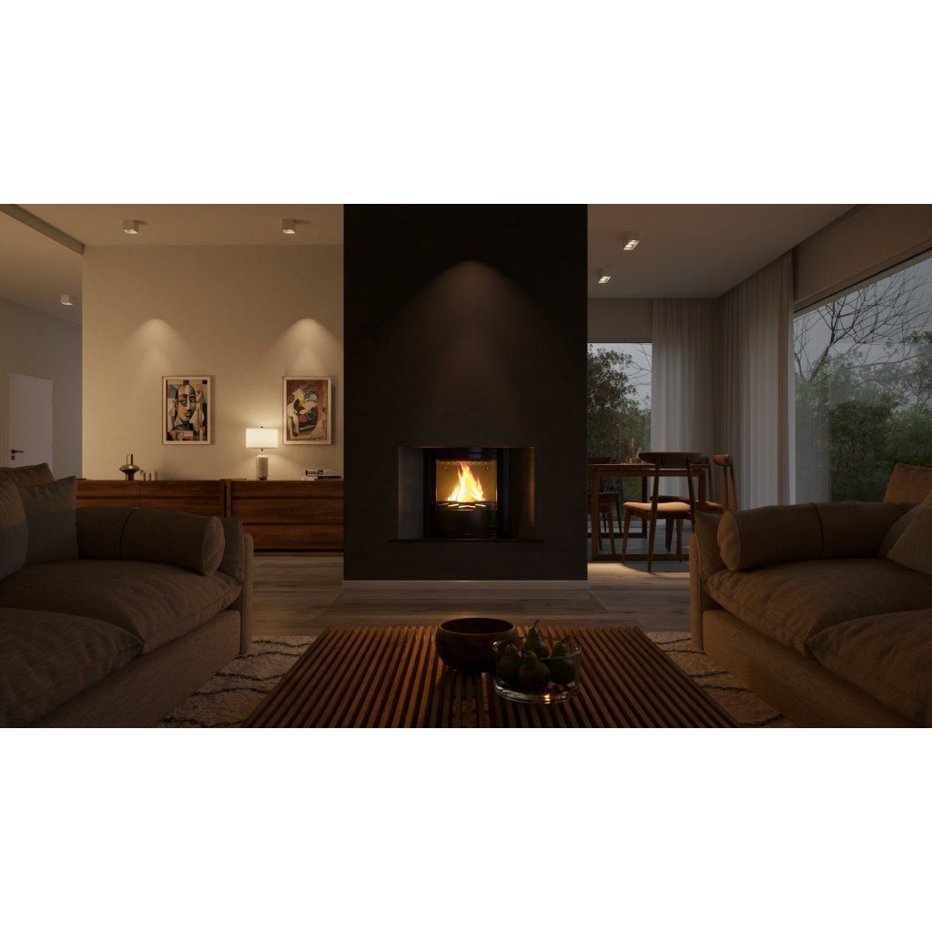 Tento poměr činí krbovou vložku AQUAFLAM PANORAMA 17 ideální pro efektivní vytápění celého domu prostřednictvím radiátorů nebo akumulační nádrže, aniž by nadměrně ohřívala prostor kolem ní.