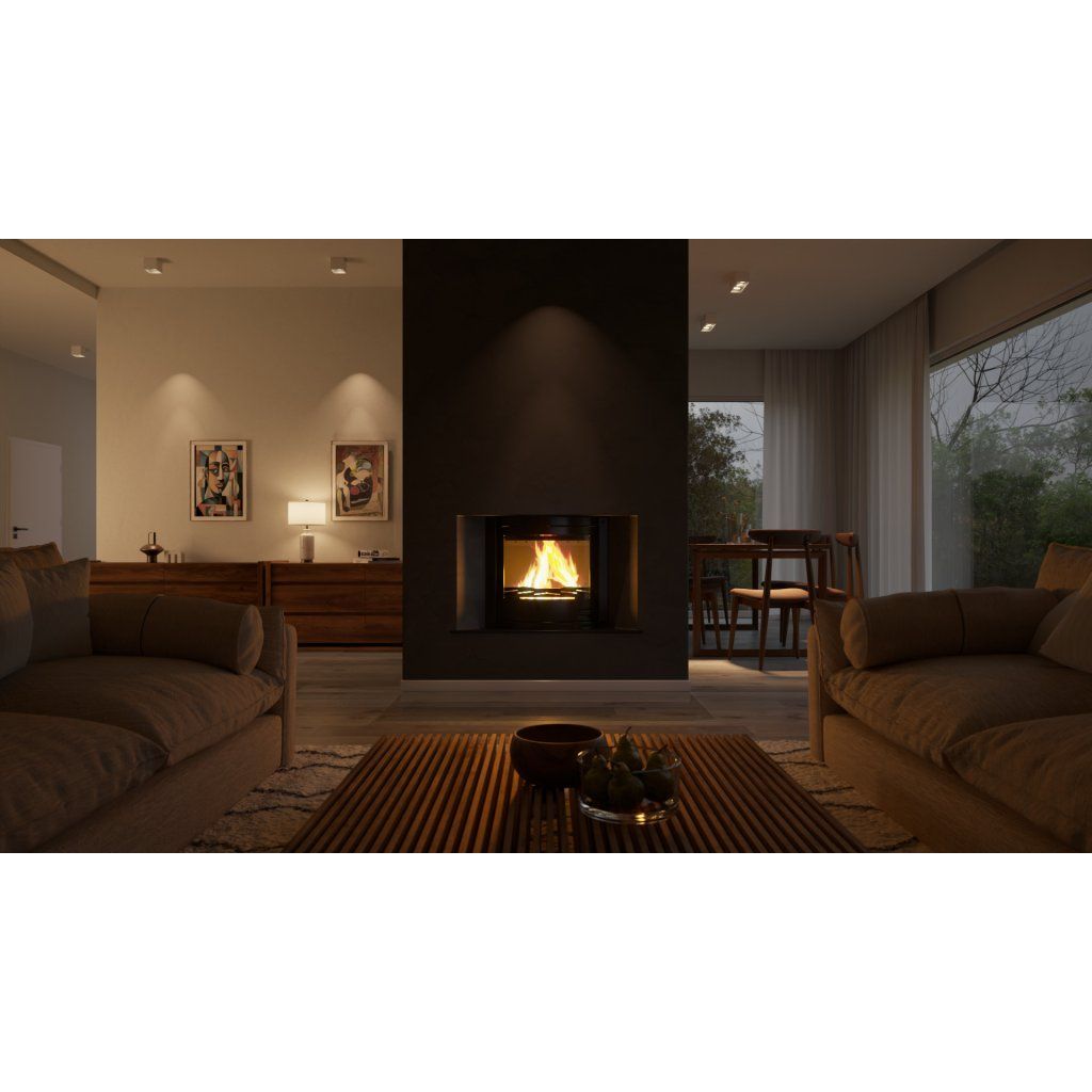 Díky tomuto poměru je krbová vložka AQUAFLAM 25 PANORAMA ideální pro efektivní vytápění celého domu prostřednictvím radiátorů nebo akumulační nádrže, aniž by nadměrně ohřívala prostor kolem ní.