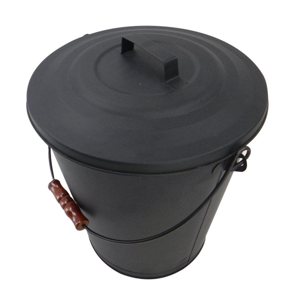 Kovová oválná nádoba na popel s víkem. Nádoba má dřevěnou rukojeť pro pohodlnou manipulaci.