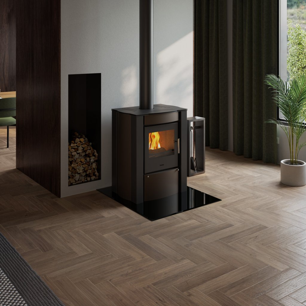 Luxusní černěné tvrzené sklo pod kamna je elegantní a praktický doplněk, který chrání podlahu před žárem, popelem a případnými jiskrami. Je vyrobeno z tepelně tvrzeného bezpečnostního skla o síle 6 mm, které nabízí vysokou odolnost vůči teplu i mechanickému poškození. Povrch je opatřen stylovým černěním, které dodává celému prostoru moderní a prémiový vzhled. Hrany skla jsou precizně opracované do fazety, což zajišťuje nejen bezpečnost, ale i perfektní vzhled.